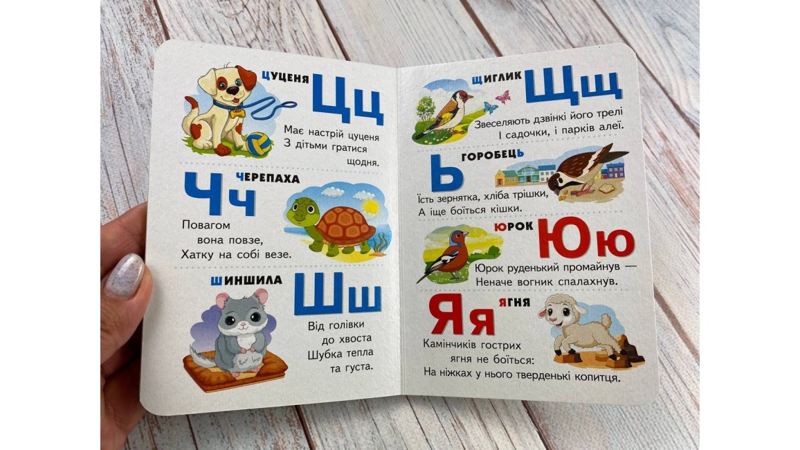 Абетка у маленькому зручному форматі, з міцними картонними сторінками