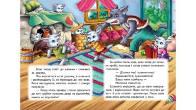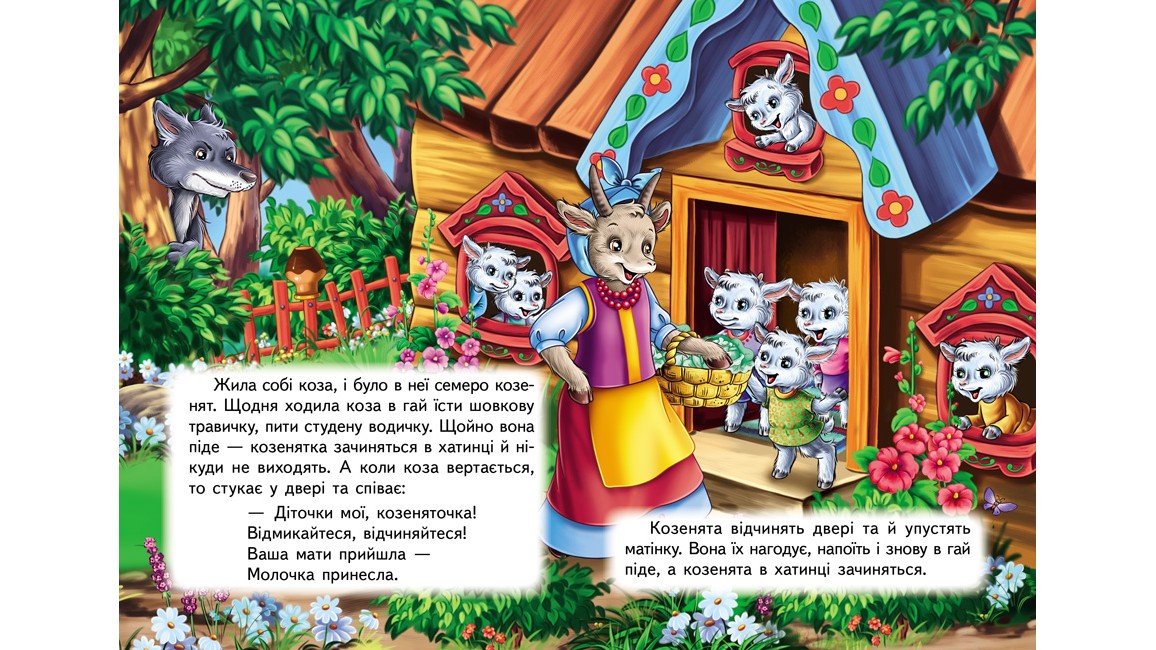 Казка Вовк і семеро козенят у маленькому зручному форматі, з міцними картонними сторінками – знайомимо малюка від 0 до 3 років з дитячою книгою та привчаємо до захоплення читанням буквально з пелюшок!